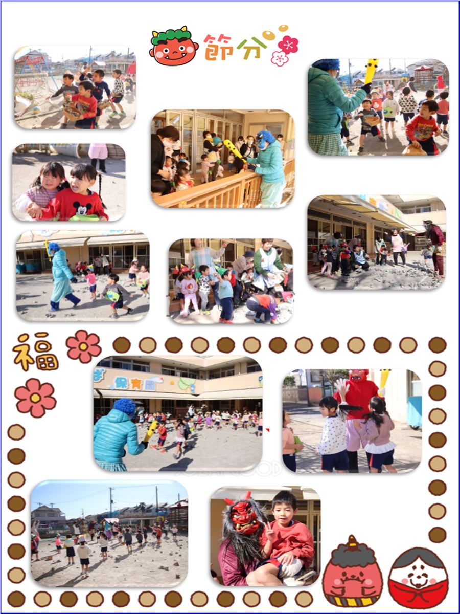 節分の集い。今年もまきば保育園に赤鬼、青鬼達がやってきました。「鬼は外〜福は内〜」と一生懸命鬼を退治していた子どもたち。最後、鬼は降参して子ども達で仲良く「鬼のパンツ」を踊りました!