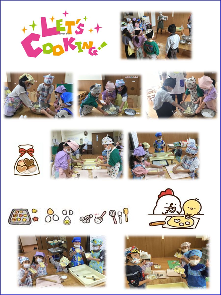 年長クラスの子ども達、クッキングでクッキーを作りました。生地作りから型抜きをし、世界に一つだけのクッキーを完成させ、おやつで頂きました。手作りのクッキーは格別おいしかったです。